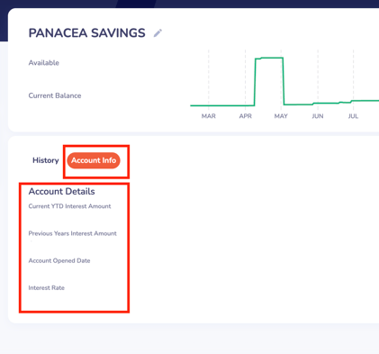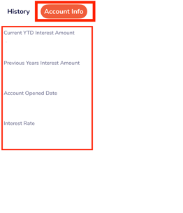 On the next screen, click on Account Info. Here you can see the Account Details such as: current year-to-date interest amount, previous years' interest amount, account opened date, and your interest rate.
